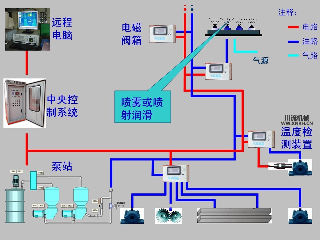 系统开始时,首先进入周期扫描检测:双油泵油位、当前工作油泵序号、当前管道内压力、当前各个工作组阀号给油量和间隔时间、主体设备润滑点的温度值。这些关联值没有报警和警告后,油泵开始启动向主管道供送油脂、加压并过滤(油泵自身一级,主油管一级,到电磁阀一级)。自至管道内油压上升到设定值时(一般为20MPa)打开第一组的第一只电磁阀,安装在电磁阀出口处的油脂流量计测量流出的油脂量,并将流量值即时反馈至中央控制柜,当流量值≥用户设定值时电磁阀关闭。等待一秒钟后打开第一组的第二只电磁阀,依次计量、检测。第一组完毕后进入第二组,以同样的计量、检测方式,自至最后一只电磁阀计量、检测完毕,系统停止,进入间隔等待状态。