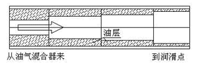 利用压缩空气在管道内的流动,带动润滑油沿管道内壁不断流动,把油气混合体输送到润滑点。压缩空气以恒定的压力连续不断地供给,而润滑油则是根据各个不同磨擦点的消耗量定量供给。使用油泵作为输油的动力来源,采用步进式给油器在进入润滑点前先进入油气混合器。在油气混合器里,流动的压缩气体把油吹成油滴,附着在管壁上形成油膜。油膜随着气流方向沿管壁流动,在流动过程中油膜层的厚度逐渐减薄,并不间断供油。间隔时间和每次的供油量可以根据实际消耗的需要量进行调节。油气润滑的工作原理见图1。