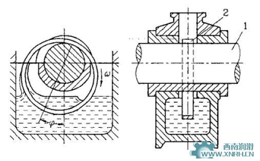 如图所示,套在轴1上的油环2下部在油池中,当轴旋转时,靠摩擦力带动油环转动,从而把油带入轴承中进行润滑。