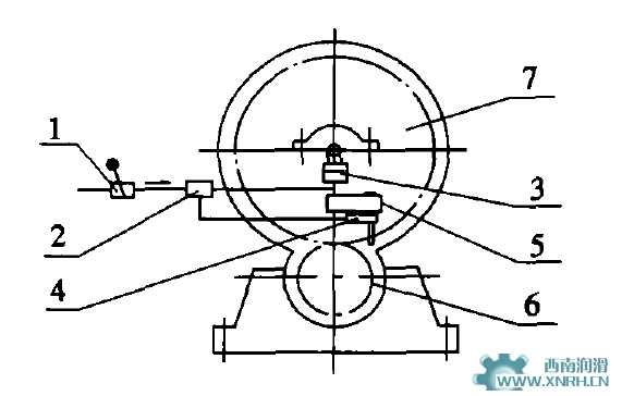 1.滚筒操作阀 2.导气三通 3.梭阀 4.气控自动润滑阀 5.润滑油箱 6.小齿轮 7.大齿轮